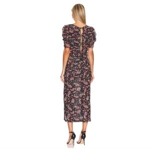 Like New. Floral pattern and ruching make this mesh midi with a slit unbelievably flattering.
