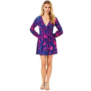 New with tags, Lilly Pulitzer, Lorelei, skirted romper in never-ending, summer color, blue med size-medium. Embrace vibrant style with this stunning blue and pink floral romper Perfect for a summer party with all the stretch fabric comfort originally $178
