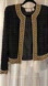 This luxurious blazer by Laurence Kazar features a rich black fabric adorned with elaborate gold metallic embroidery along the edges, creating a sophisticated and timeless look. The cropped design and fitted structure make it perfect for formal evening occasions, while the ornate detailing adds a touch of vintage-inspired elegance. Padded shoulders, lightweight, sequins in tan, brown & faux pearls details, has an hook & eye closure top neck area. Flaws are pictured (last 4 pics): missing black sequins which are barely noticeable and minute areas of holes on left shoulder pad which blends with it. PTP: 21”, L: 19”