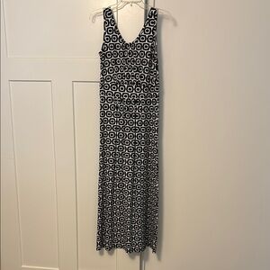 This casual sundress by Ann Taylor features a striking black and white geometric print, perfect for a relaxed day out. The sleeveless design and V-neckline add a touch of elegance, while the flowing maxi length ensures comfort and style. Crafted from a soft, drapey fabric, this dress moves beautifully with every step.