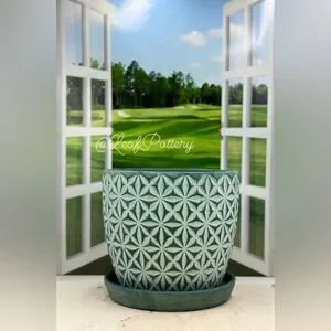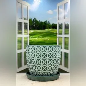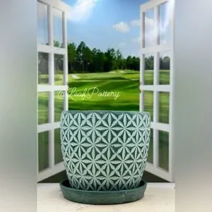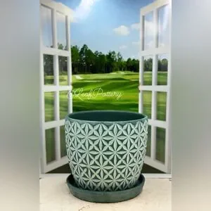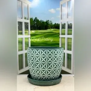 Dimensions: 7”H x 7.9”W, Opening 7.10”, weight 5lbs 5.5oz, Materials: Clay, Drainage hole, Made in China , Color: Green, Perfect for Indoor/Outdoor gardening, Don’t forget to dress up your plants 🪴