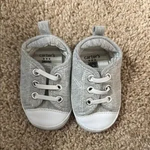 These Carter's sneakers feature a classic gray and white design with a soft canvas body and durable rubber sole, perfect for everyday adventures. The white laces and metal eyelets add a touch of style, while the flexible construction ensures comfort for little feet. A convenient heel tab makes them easy to put on and take off.