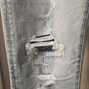 Trendy distressed jeans in light blue. Perfect for casual wear. slim fit. bought new last year for Christmas but he hasn't worn it.