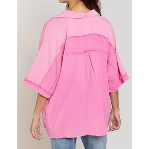 Discover the oversized Short Sleeve Shacket by POL, a beautifully crafted piece in pink that combines style with comfort. Featuring an oversized fit, this top boasts unique wide half sleeves for a relaxed look. Composition: 100% Cotton, made in China, ensuring a breathable and soft feel. Closure: Button closure. Care: Machine wash cold on a gentle cycle and tumble dry low.