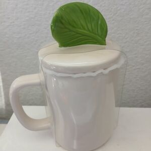 Rae Dunn Cream Mug with Green Leaf Lid - 'Leaf Me Alone'