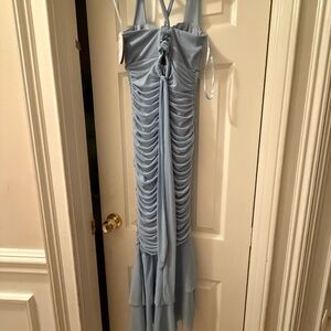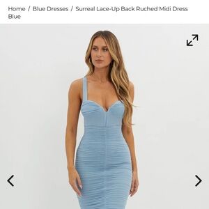 This elegant blue bodycon midi dress by Selfie Leslie features a flattering sweetheart neckline and thin spaghetti straps, perfect for a wedding guest or cocktail occasion. The dress is designed to hug your figure with its stretchy material, offering a sophisticated and timeless look.
