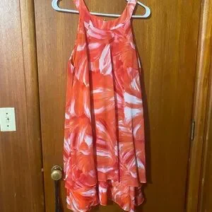This sleeveless sundress by Studio One features a striking orange and pink color palette, perfect for a wedding guest or cocktail occasion. The halter neckline and asymmetrical design add a touch of elegance, while the airy fabric ensures comfort and style. Its artistic print and flowing silhouette make it a standout piece for any event.