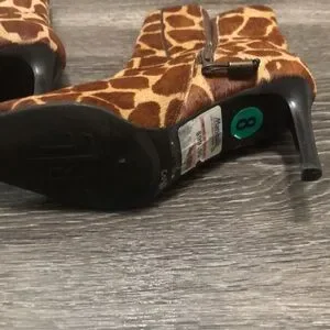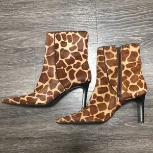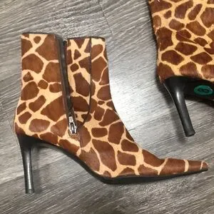 Step up your shoe game with these bold and stylish Ralph Lauren giraffe print boots! These statement ankle boots feature genuine pony hair with a giraffe pattern, sleek pointed toe, and a mid-height stiletto heel. An inside zipper makes them easy to slip on and off, while the classic silhouette makes them perfect for dressing up jeans or pairing with a fall dress. Unique and rare β you wonβt find these in stores anymore!