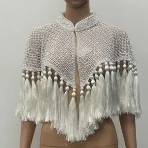Experience elegance with our White Luxury High Neck Hand-Beaded Cape, embellished with sophisticated black tassel trimming. Effortlessly versatile, this one-size-fits-all cape is the epitome of refined style. (Some customers move hook and eye clasp down an inch if too snug at the neck)