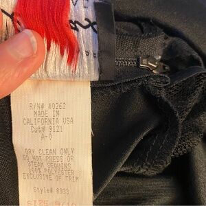 Black button and zipper opening. A silky polyester with black net at bodice.