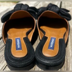 Margaux The Bow Mule, black suede & ribbon, size 38 but fits a 6.5 maybe a small 7. Handmade in Spain. Super cute shoe!!