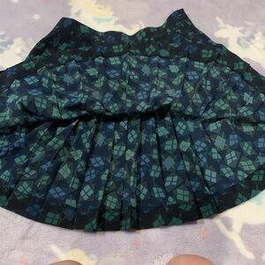 Description: Pleated Tennis Skirt, Dark Blue and Green Plaid Windowpane Pattern. Has Button and Zipper Closure on Right Side.