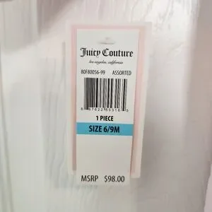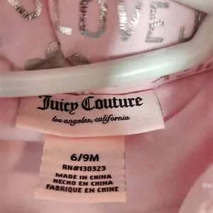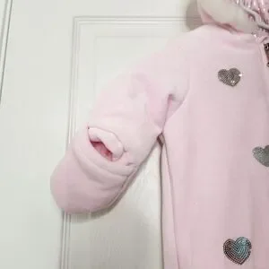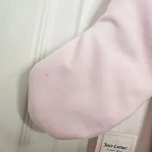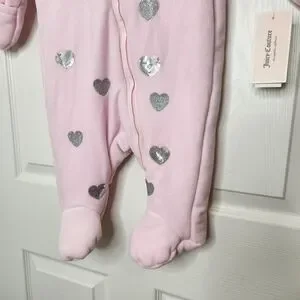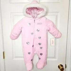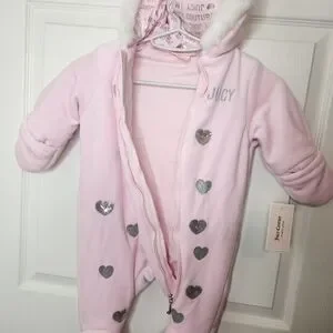 Baby Juicy Couture bunting winter suit, one piece. Pale pink with silver sequin hearts. Faux white fur lined hood. Full zipper, super soft. NWT. Size 6-9 months.