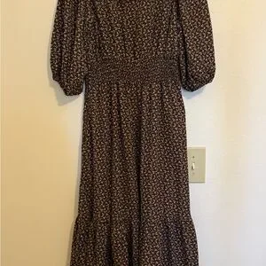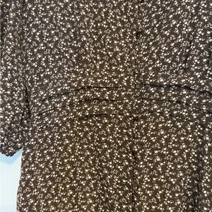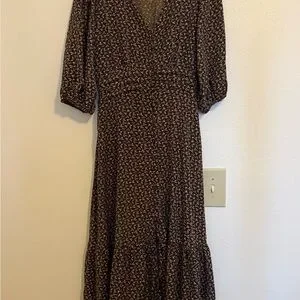 Embrace effortless style with this Aura sundress, featuring a tiered/ruffled design in a rich brown hue. The dress boasts a flattering wrap style with a v-neckline and 3/4 bishop sleeves, perfect for casual or work settings. Its lightweight fabric ensures comfort and elegance throughout the day. Functional buttons. No stains, tears, damages or defects