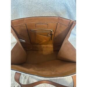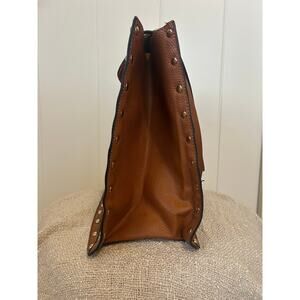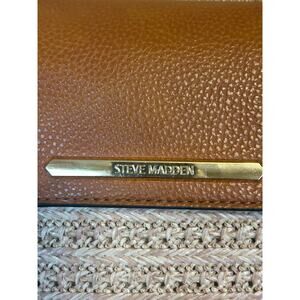 Super cute Bstraw Steve Madden large tote with gold tone, stud, design, and fold over snap closure. Inside features a soft lining with one slip pocket and one small zip pocket. Perfect summer bag great for every day to fit all your essentials or that beach vacation. Excellent preowned condition.