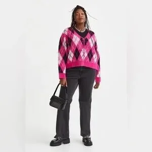 Stay stylish and cozy with this vibrant pink argyle sweater. Perfect for adding a pop of color to your wardrobe.