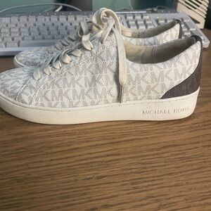 These Michael Kors sneakers feature a unique gray marbled pattern on the upper, complemented by white laces and metallic eyelets. The classic low-top silhouette and neutral color scheme make them perfect for casual outings. The white soles add a clean, stylish touch to these distinctive sneakers.