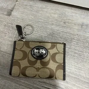 Elegant Coach pouch with signature pattern. Features a keychain and metal logo accent.