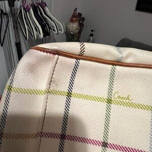 This Coach satchel showcases a sophisticated blend of cream and pink hues, embodying timeless elegance. Crafted with meticulous attention to detail, it features a structured silhouette and premium materials, making it a versatile accessory for any occasion. Minimal wear. Gorgeous bag, super fun plaid print
