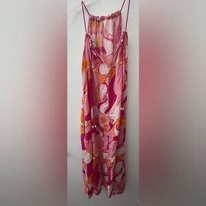 Adjustable neck straps for bold dress with vibrant pink and orange hues and pockets on each side.. Perfect for standout style.