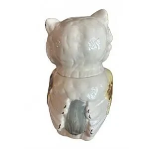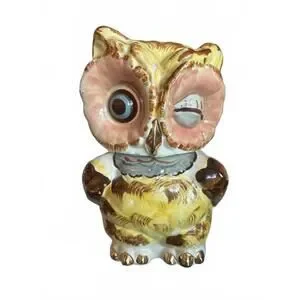 Bring a touch of whimsy to your decor with this charming Vintage Ceramic Winking Owl coockie jar. Characterized by its playful design and rich colors, this owl features bright yellow, pink, and brown hues that make it a delightful focal point. Perfect for collectors or as a unique gift, it adds a nostalgic vibe to any setting. Key features include: - Made from durable ceramic - Intricate detailing with a glossy finish -