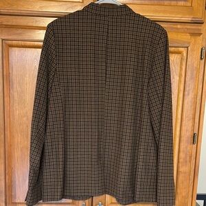 Chocolate brown silk lined. Different shades of brown and black in the pattern, goes with a lot of things