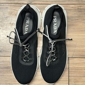 Authentic Woman’s Prada black lace up knit sneakers. Size 38.5 EU. In excellent condition. Hardly worn, look quite new, see photos. No box.
