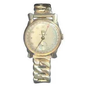 Two Tone Original Silver Subseconds Dial With Gold Hour Markers and Matching Gold Hands. Day Aperture Above-Center. Red-Tipped Arrow Hand Points to Outer Date Chapter from 1-31. Date Can Be Quickset by Pushing on the Crown to Advance the Date Hand. Dial Signed Benrus and Swiss.