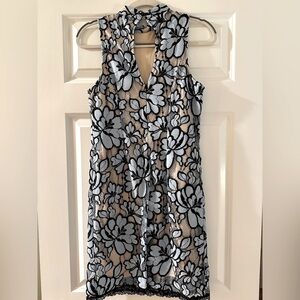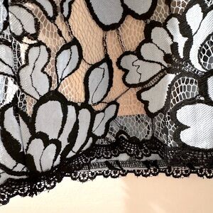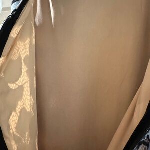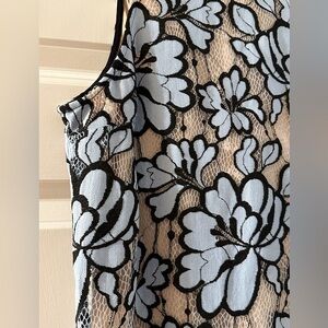 sleeveless , back zip closure. black blue lace overlay against a nude underlay