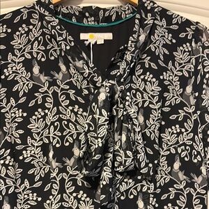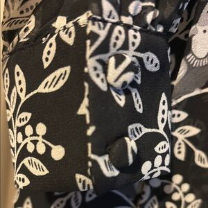 Boden elegant black and white floral dress is perfect for any occasion. Its sophisticated design offers a timeless look. Ideal for both casual and formal events. Sheer long sleeves with buttons. Button detail down middle. Tie neckline, can be left open or bow