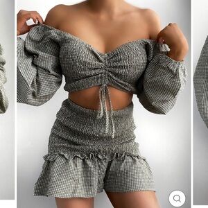 Feel like the girl next door in this flirty Havana Set. The Skort is high waisted and made from an olive gingham fabric with a frill hemline. This beauty also features an on or off the shoulder sweet heart neckline with long sleeves and a drawstring detail at the front. She has shirred fabric throughout the whole body for the perfect fit and comfort. We love it paired with white sneakers or even nude ankle strap heels!