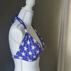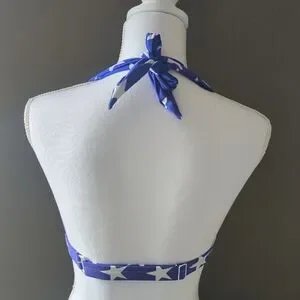 Stylish bikini top with a star pattern. Halter neck design. Perfect for beach days.