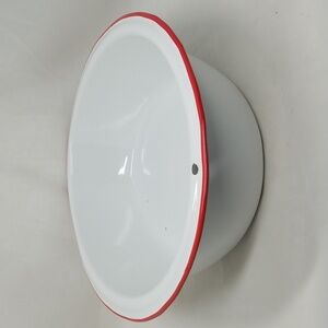 Antique white with red trim enameled metal oval baby wash basin bowl tub. 18" x 13 ¾" and 4" tall. Has some missing paint and a bend in the rim on one side ( see last 2 pics).