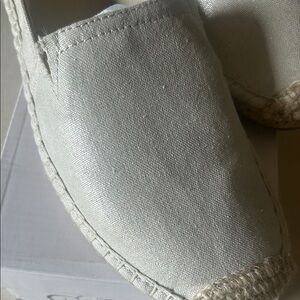 These cream espadrilles from 143 Girl feature a classic rope sole and a simple slip-on design, perfect for casual outings. The fabric material offers a subtle shimmer, adding a touch of elegance to your everyday look. With a rounded toe and neutral interior lining, these shoes are both stylish and comfortable. Never wore
