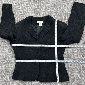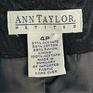 Elevate your wardrobe with this elegant black blazer from Ann Taylor, featuring a textured brocade fabric that adds a touch of sophistication. The tailored fit and notched lapel create a polished look, making it ideal for both professional settings and stylish outings. Its form-fitting design ensures a flattering silhouette, perfect for any occasion. It features a 3-button front closure and shoulder pads. A size 4 petite, it is in excellent used condition. Please look over the pictures carefully and let me know if you have any questions.