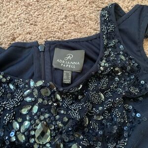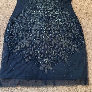 This stunning Navy dress features a scoop neck and back, with intricate rhinestone, beaded, and sequin embellishments, perfect for any special occasion. Its elegant design ensures you stand out in style.