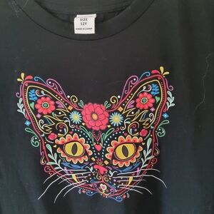 The planet t-shirt is a 14 and is 23.5 inches top to bottom. The stores shirt is an 11/12 and is 24 inches. the cat shirt is a 12 and is 20 inches. the purple shrug is a 7/8 and is 13 in length with the sleeve length at 25. the green sweater is 13/14 and is 25 inches long. and the overall shorts (which have an added button hole) are a 10/12 and it's 27 inches long at the longest button hole.