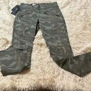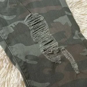 Pull up. Camo print. Denim Distressed. Mid rise. Stretchy. Ultra slim through hip and thigh. Inseam is a 28”