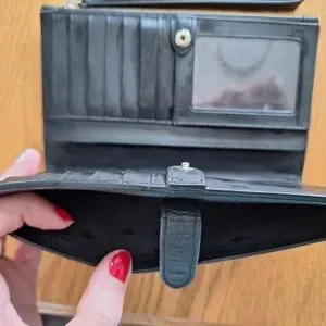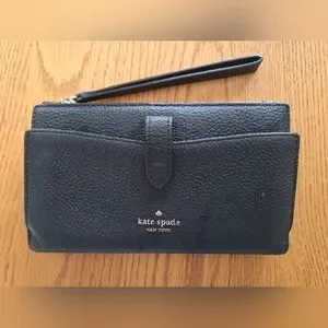 Chic black leather clutch by Kate Spade. Features a convenient wrist strap and elegant design.