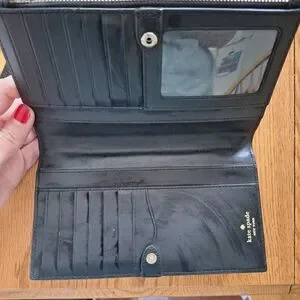 pocket on front fits phone easily, lots of space for cards and zipper pouch for storage. EUC, some fading on front logo. Purchased from kate spade website a few years ago.
