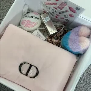 Dior set featuring pink Dior beauty pouch with unbranded chain and heart charm.