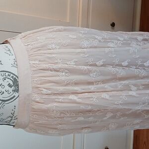 Boston proper lace maxi skirt features a delicate ballet pink color, perfect for any occasion. Its flowing design adds a touch of sophistication to your wardrobe. Fully lined, no need for a slip. Wear with cowboy boots or sandals in summer. Hidden side zipper and button. Waist measurements approximately 14" length approximately 38"