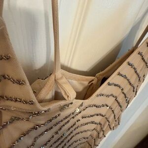 This elegant tan evening gown is perfect for special occasions. Its flowing design and intricate detailing offer a sophisticated look.