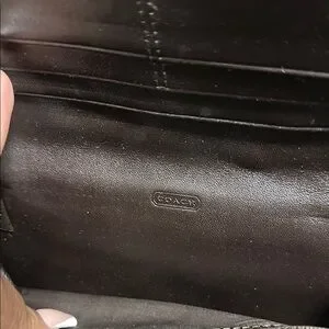 Elegant Coach wallet with iconic pattern. Rich brown leather accents. Perfect for any occasion. Excellent condition.