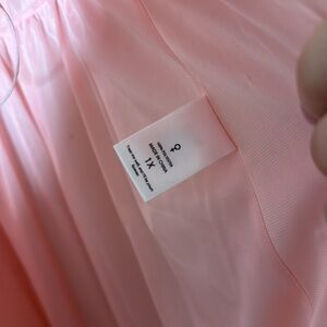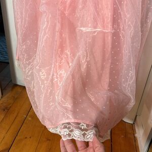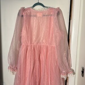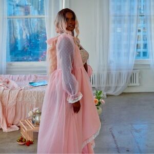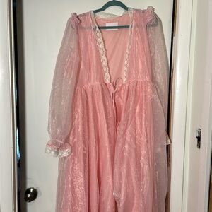 Elegant pink high low robe by Selkie. Features sheer long sleeves and lace trim. Perfect for special occasions. Only worn once. You will feel like a princess.
