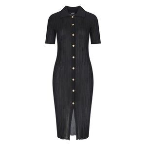 This Versace midi dress exudes sophistication, made from luxurious black stretch viscose. The pleated design features a classic collar and short sleeves, with intricate ribbed detailing. A distinguished button closure with the iconic golden Medusa adds opulence, while the deep front slit and straight hem enhance your silhouette.