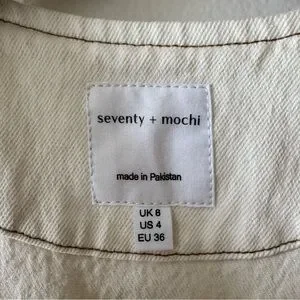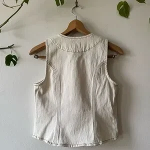Elevate your style with this cream denim vest by the consciously kind, LA brand seventy + mochi. The waistcoat features a button-front closure, two front patch pockets, and contrast stitching that accents the seam lines. Perfect to wear on its own or to layer over a shirt or dress. Limited quantities still being sold online for full list price. In excellent gently worn condition with no flaws to note. A versatile addition to any wardrobe.
