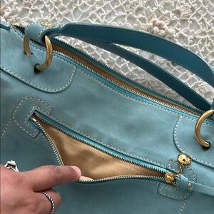 This elegant blue handbag is perfect for any occasion. Its sleek design and high-quality materials make it a must-have accessory. In good condition :)