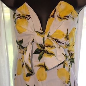 sz S English factory Brighten your wardrobe with this stunning lemon print strapless jumpsuit. Perfect for sunny days, this dress features a vibrant yellow and green pattern on a crisp white background. Ideal for casual outings or summer events.