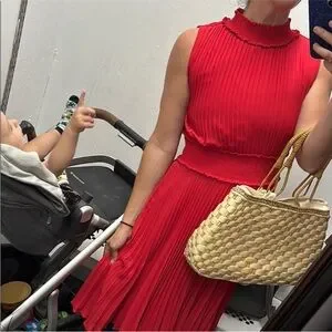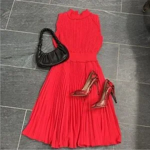 An elegant midi dress is detailed with a ruffle-shirred neckline and a mirrored detail at the waistline. The flattering shirred detailing is complemented by fluttery sunburst pleating at the sleeveless bodice and skirt.